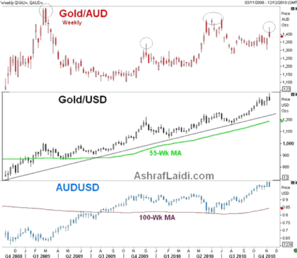 El oro bajará mientras el dolar suba. Puede parecer de perogrullo, pero la mayoría de los americanos no se están dando cuenta de que el famoso rally del oro no lo es realmente si se le mira desde otra moneda. Aquí está por ejemplo frente al dolar australiano, donde el oro tiene precios de finales del 2008, o frente al euro, donde el oro tiene precios de abril del 2010.