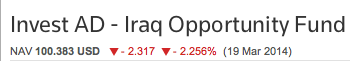 El Invest AD - Iraq Opportunity Fund es un fondo de inversión que invierte su patrimonio en acciones de empresas que tengan su sede ó que generen la mayor parte de sus ingresos en Iraq, cuyos principales datos macroeconómicos en 2.012 son los siguientes: * Producto Interior Bruto............................................. 163.490 millones de Euros. * Deuda Pública........................................................... 53.273 millones de Euros. * Deuda Pública sobre Producto Interior Bruto.................. 52.17% * Exportaciones...................................................... 73.474 millones de Euros. * Importaciones....................................................... 44.365 millones de Euros. * Balanza Comercial................................................. 29.110 millones de Euros.